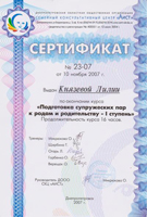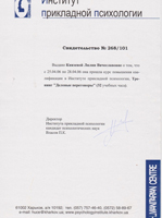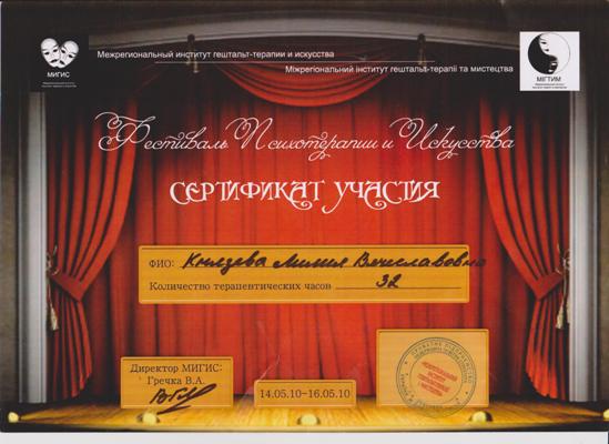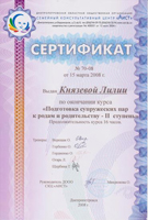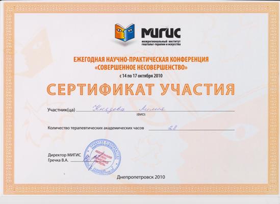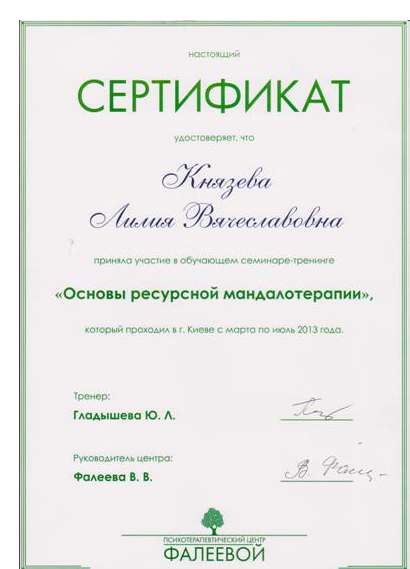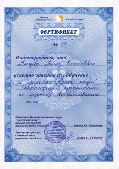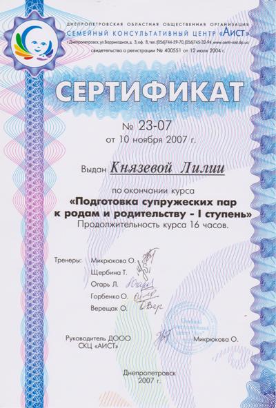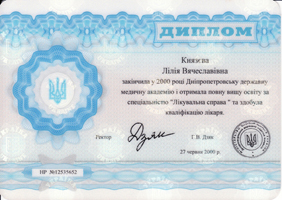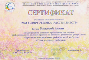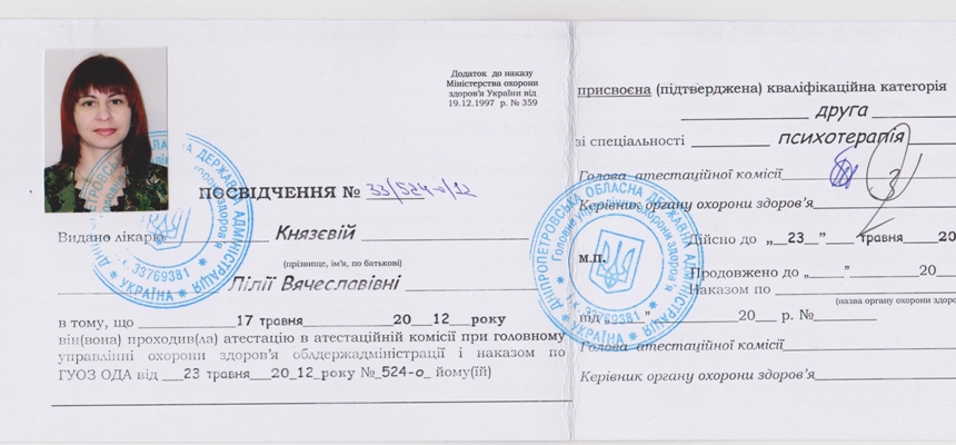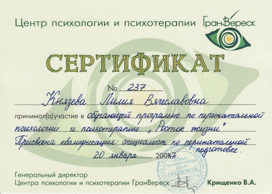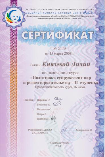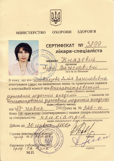 ОБРАЗОВАНИЕ: Днепропетровская государственная медицинская академия ГОСУДАРСТВЕННАЯ СЕРТИФИКАЦИЯ: 27.06.2001г. - сертификация по психиатрии. (ДГМА) НЕГОСУДАРСТВЕННАЯ СЕРТИФИКАЦИЯ: 20.01.07 г. - Центр психологии и психотерапии "ГранВереск" (г. Киев). Специализация: специалист по перинатальной подготовке. Обучающие семинары-тренинги: 14.10.2007., 10.11.2007.,15.03. 2008. -"Подготовка супружеских пар к родам и родительству". (СКЦ "Аист", г. Днепропетровск) Обучающие программы: 2007-2010г. - гештальт-терапия (МИГИС, г. Днепропетровск) Принимала участие: Форум "Перинатальная культура. Возможности взаимодействия медиков и психологов в интересах матери и ребенка" (г. Одесса, 27-29- июня 2008 г.) ПРОФЕССИОНАЛЬНЫЙ ОПЫТ: 1. ГБ №1 г. Днепродзержинск - детский психиатр 2001-2004 г. СПЕЦИАЛИЗАЦИЯ: Индивидуальное консультирование взрослых, детей, подростков. Семейное консультирование. Подготовка к родам. Консультации по раннему развитию детей для родителей и специалистов. Психотерапевтическая помощь при неврозах, страхах, психосоматических расстройствах у детей и взрослых. Нарушения поведения у детей, трудности в детско-родительских отношениях.