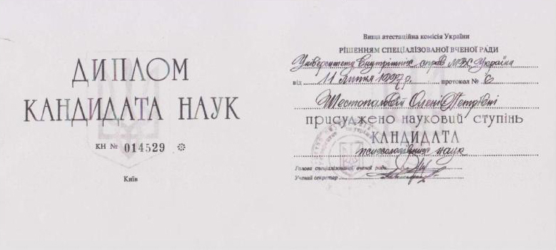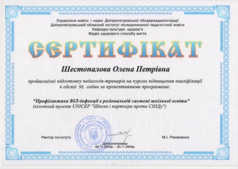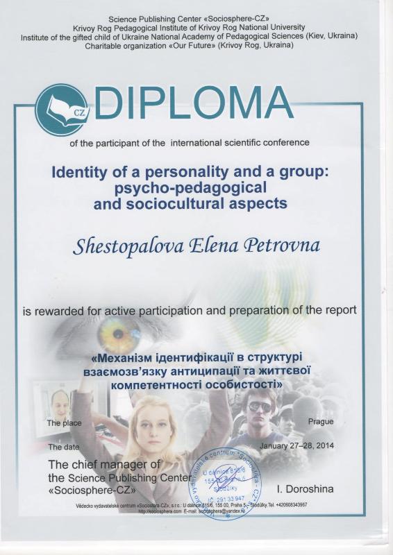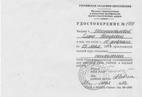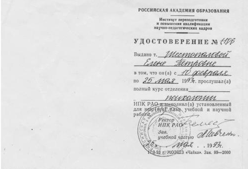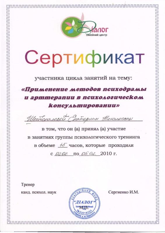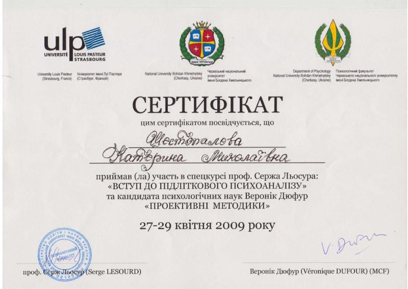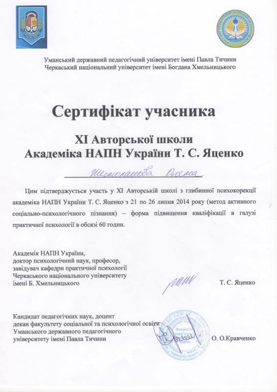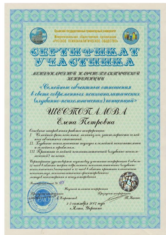 Повышение квалификации «психология» для научно-педагогических кадров (г. Москва, Институт повышения квалификации научно-педагогических кадров). Повышение квалификации «социальная психология» (г. Киев, Институт одаренного ребенка при Академии наук Украины). НЕГОСУДАРСТВЕННАЯ СЕРТИФИКАЦИЯ: 01.10.2007 г. – Русское психоаналитическое общество РПО, Крымский гуманитарный университет (г. Ялта). Специализация: семейные объектные отношения в русле психоаналитических концепций. 02.04.2009 – Институт имени Луи Пастера, Черкасский национальный университет (г.Черкассы). Специализация: лаккановский психоанализ и проективные методы в работе с подростками. 01.11.2011г. – БГУ им. В.Танка, МГУ им.М.Ломоносова (г. Минск). Специализация: он-лайн консультирование в семейной психотерапии. Обучающие семинары-тренинги: 6.10.2006г., 1.10.2007г., 4.10.2009г., 3.10.2010г., 01.10.2012 г., 02.10.2013 г., 25.07.2014 г. – «Глибинні методи психокорекції» (216 год.): метод АСПО (акад.Т.С.Яценко), психоанализ (д.п.с.н. Калина Н.Ф.), лаккановский психоанализ (проф.С.Лессур), психодрама (д.пс.н. Горностай П.П.), арт-терапия (к.пс.н. Старовойтов А.В.), аналитическая терапия (Зеленский В.В.), сексология (Любарский А.), клиент-центрированный подход (проф. Кочарян А.С.) и др. ОСНОВНОЕ НАПРАВЛЕНИЕ: Системная семейная психотерапия: - проблемы молодоженов и их родителей; - семейные кризисы: уход детей из дома, измены, ревность; - детско-родительские отношения: сложные дети и подростки, как установить отношения с отчимом, развод родителей; кризисная психология и психология травмы: - психотравмы насилия; - посттравматический стресс в ситуации военных действий; - экзистенциональный кризис (утрата жизненных планов); коррекционно-развивающие занятия с детьми и подростками: - сложности обучения в школе: развитие мышления, памяти. внимания; - коррекция дефектов речи; - подготовка к поступлению в школу; - психологическое сопровождение гиперактивных детей / или с синдромом дефицита внимания. психологическое сопровождение ребенка с особыми потребностями: - коррекционное сопровождение детей с аутизмом; - коррекционное сопровождение детей на домашнем обучении; -конфликтология; - профориентация; коуч.